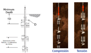 El pilote helicoidal obtiene su capacidad a través de la sumatoria de las capacidades soportantes que generan cada una de las hélices.