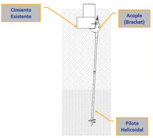 Consiste en detener o incluso recuperar los niveles de una estructura que este sufriendo de asentamientos. Esto se alcanza apoyando el cimiento existente puntualmente en pilotes helicoidales mediante ménsulas o brackets metálicos los cuales a su vez se apoyan en pilotes helicoidales instalados adyacentes a dicho cimiento.