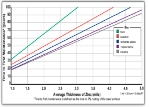La fábrica maneja espesores promedio de 5-9 mils ≈ 127-229 μm que son mayores a los de norma por temas de protección ante la mala manipulación o transporte del material y así evitar perdida del espesor requerido, además de darle una mayor vida útil a la que la norma requiere y prácticamente una anulando la necesidad de mantenimiento o reemplazo de los mismo debido a corrosión.