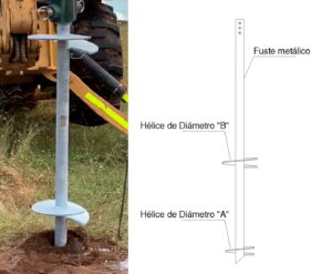 Pilote helicoidal en instalación y diagrama de un pilote helicoidal.