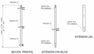 El pilote helicoidal se conforma de una sección principal con hélices acorde a diseño y secciones adicionales que pueden o no tener más hélices, extensiones lisas y finaliza con un “CAP” o placa de trasferencia de cargas que va embebida en la cimentación o conexión a la estructura.