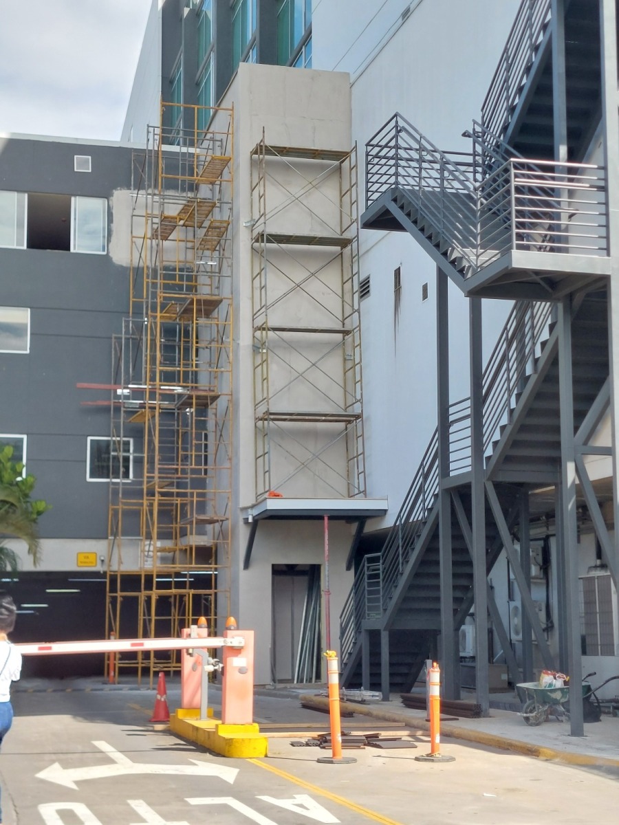 Se amplia el edifico de 2 niveles existentes a 4 a través de nuevas columnas internas y externas; todo soportado sobre pilotes helicoidales. |