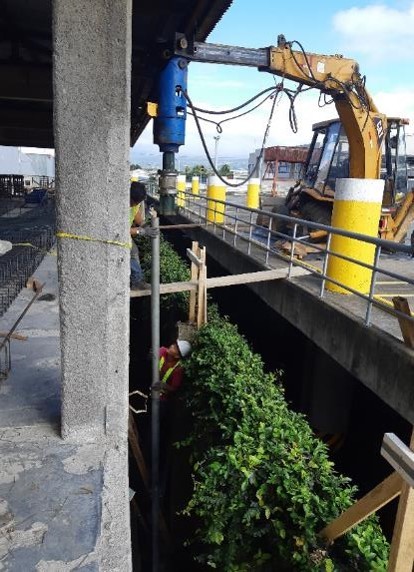 123 pilotes para casa guarda parques, 108 pilotes para Bodega, 38 pilotes para atracaderos y 46 pilotes para aceras; todos entre 3.5m y 10.5m de profundidad |